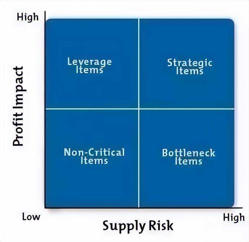 卡拉杰克矩阵以采购所牵涉的两个重要方面作为其维度:收益影响(ProfitImpact):采购项目在产品增值、原材料总成本比及产品收益等方面的战略影响。供应风险(SupplyRisk):供应市场的复杂性、技术创新及原材料更替的步伐、市场进入的门槛、物流成本及复杂性、以及供给垄断或短缺等市场条件。将供应商分为四类,杠杆供应商,瓶颈供应商,战略供应商和非关键性项目供应商。
