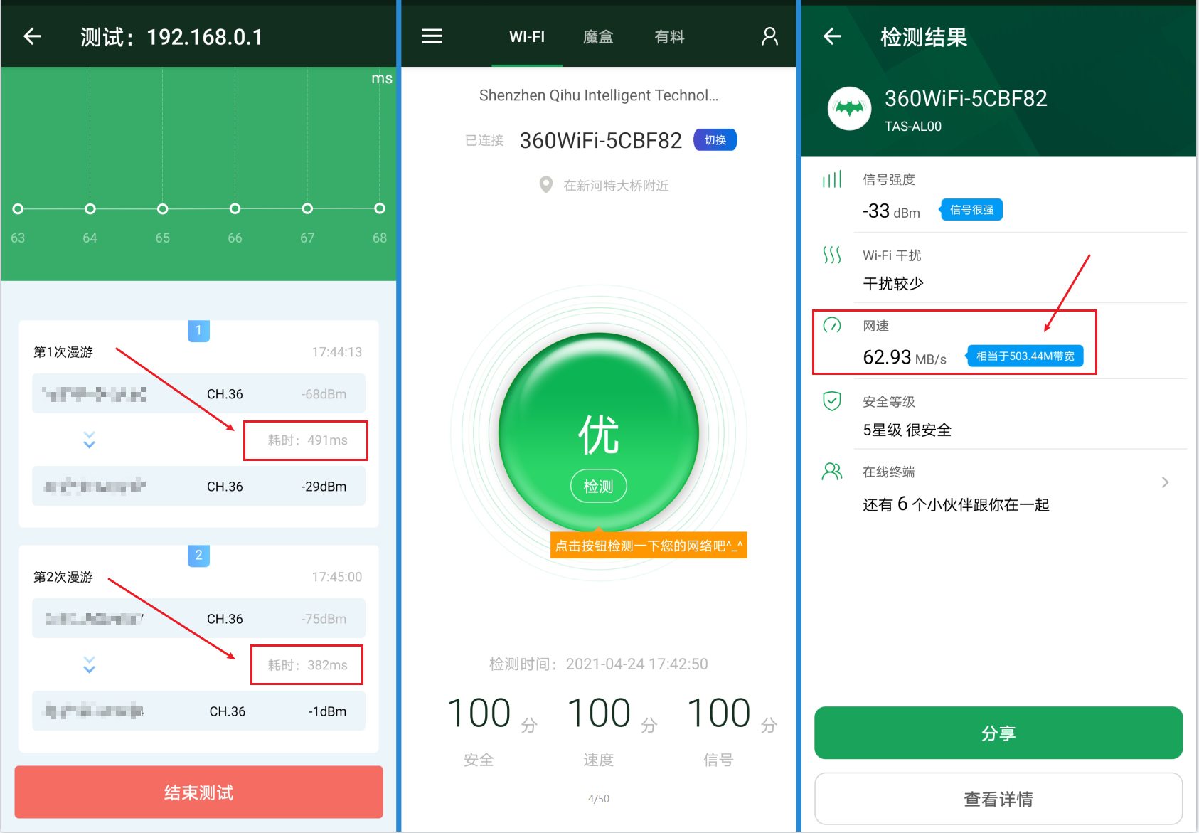 而后续检测跑分,均达到满分,网速测试和信号测试都是妥妥的OK: