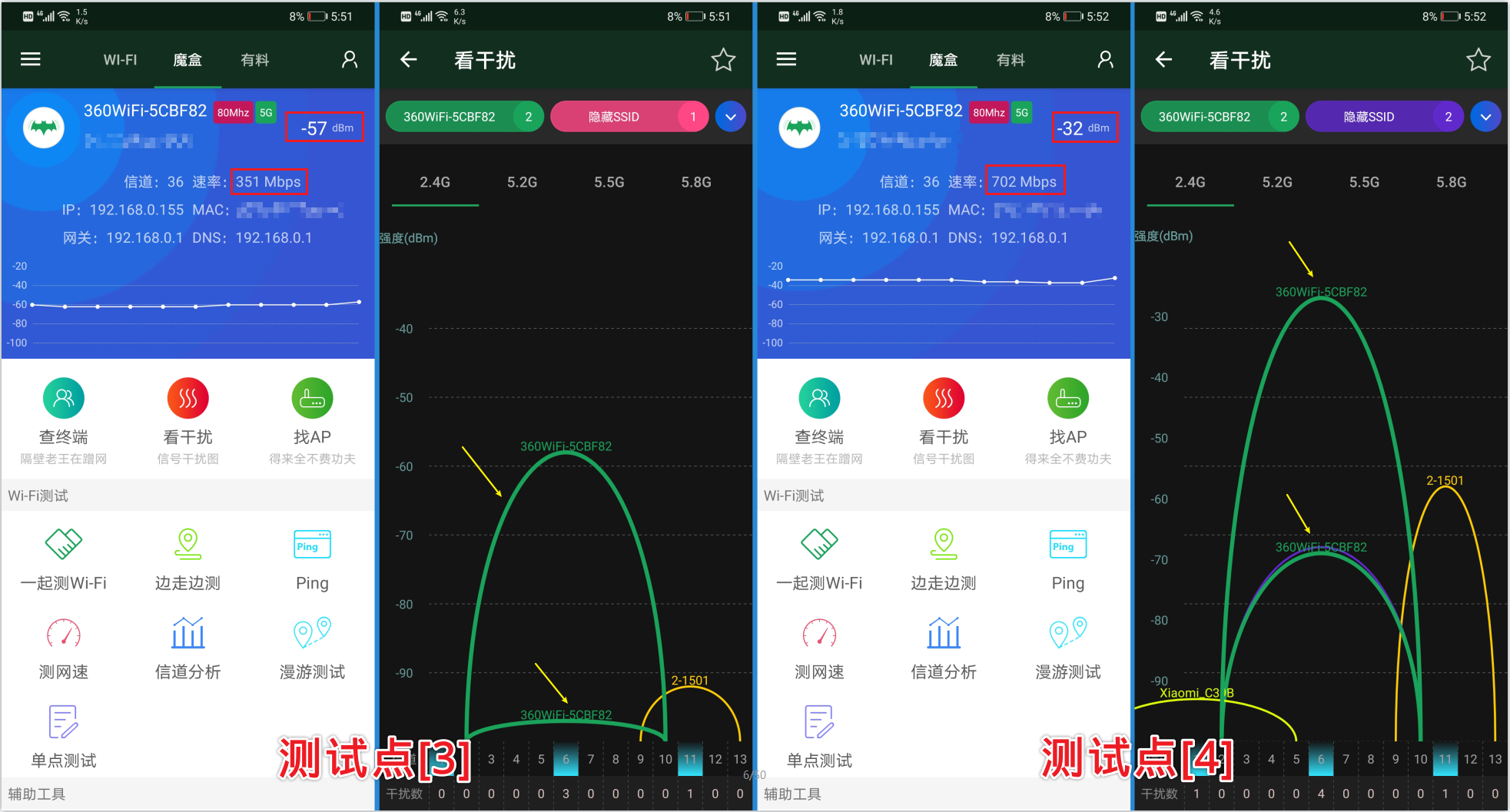 6、测试点[3]是次卧:信号是-57dB,速率达到了351Mbps,这个表现还是不错的,连接的是客厅的分身路由,在下图2信号干扰中,可以看到书房的主路由信号是绝对没法用的,墙太多了。
